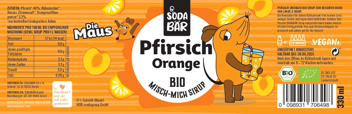 Pfirsich-Orange: Pfirsich* 46%, Rübenzucker*, Wasser, Zitronensaft*, Orangensaftkonzentrat* 2,3%